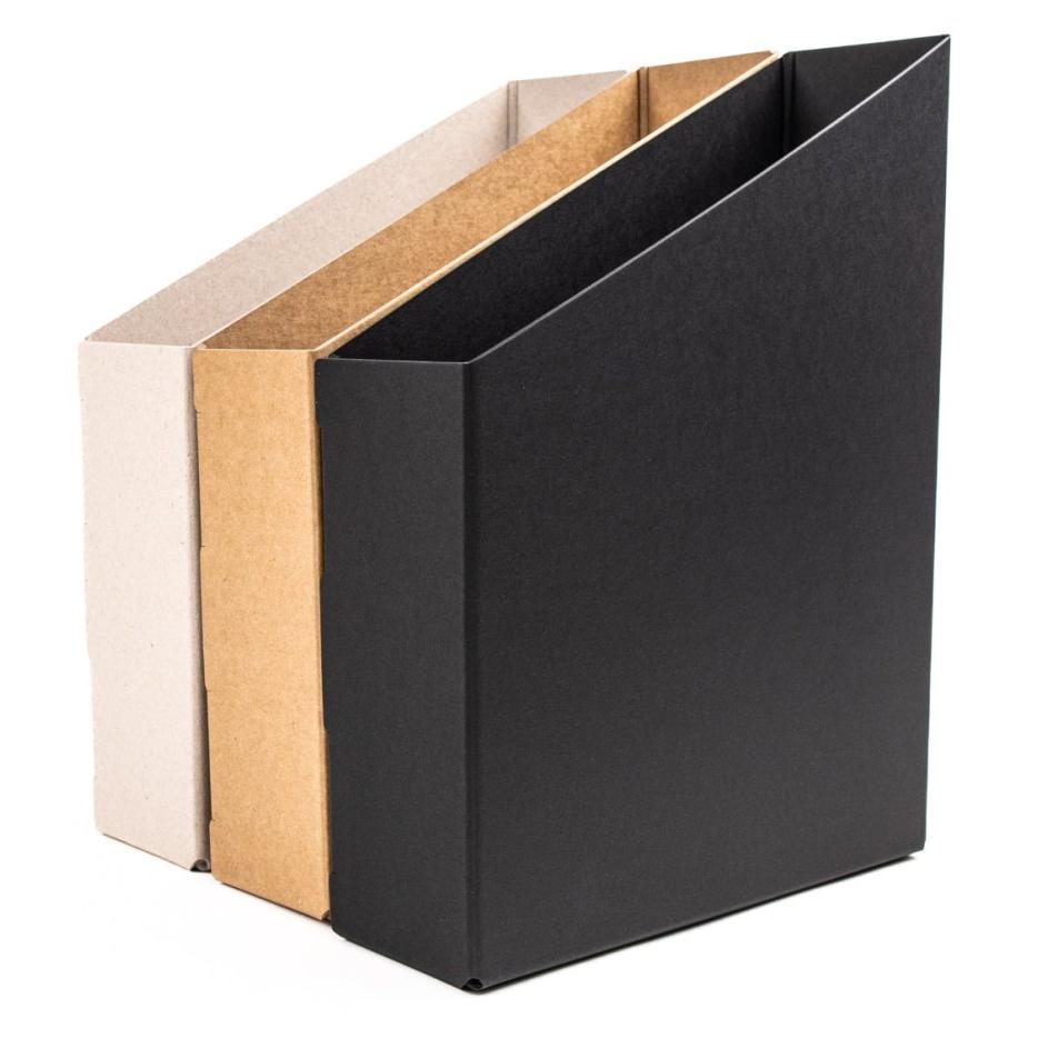 » Stehsammler für DIN A4» Größe: 240 x 320 x 80 mm» Farben: Schwarz, Craft (Braun) & Recyclingkarton (Grau)» geöstes Griffloch » PEFC & FSC Umwelt zertifizierte Pappe